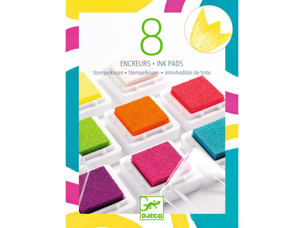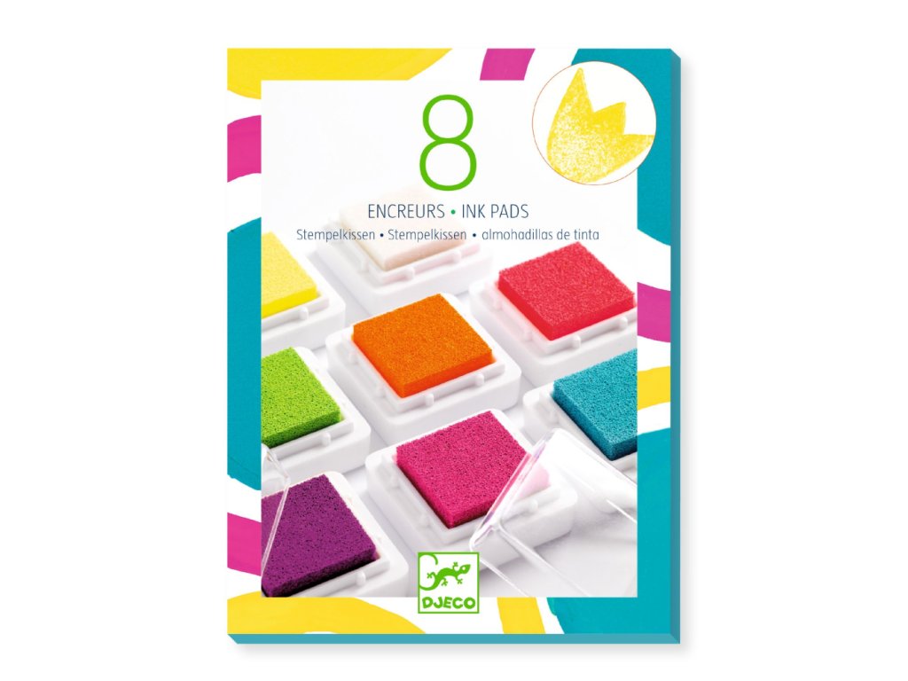 Sada obsahuje 8 pečiatkových podušiek s atramentom výrazných pop farieb, vrátane 2 krikľavých a 1 čistiacu podušku.