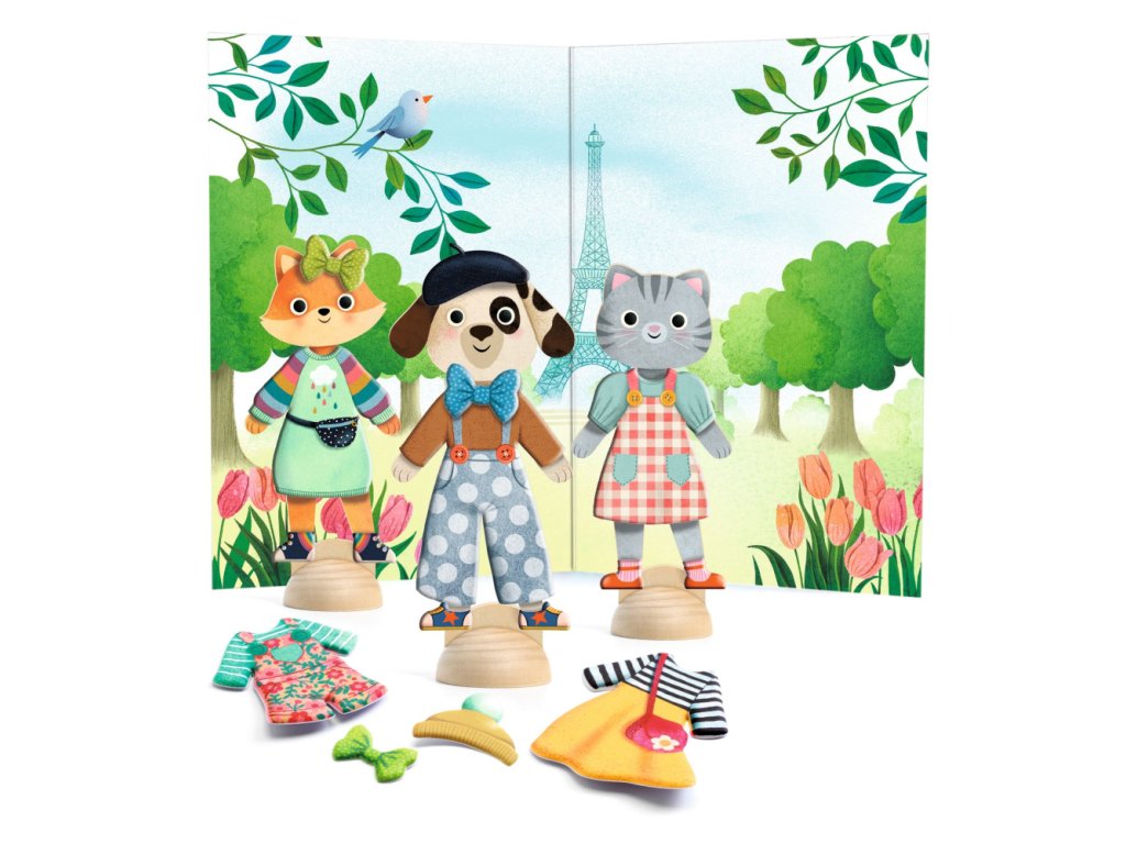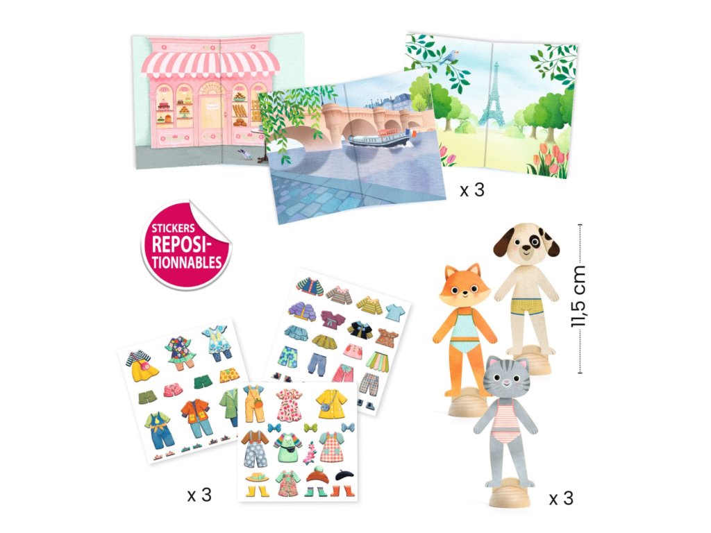 Obsah: 3 drevené postavičky so stojanmi, viac ako 45 kusov oblečenia (3 listy) pevných opakovane použiteľných odolných odlepiteľných pufových samolepiek na obliekanie postavičiek, 3 dizajny z FSC® lepenky a 1 obrázková brožúra s podrobnými pokynmi.