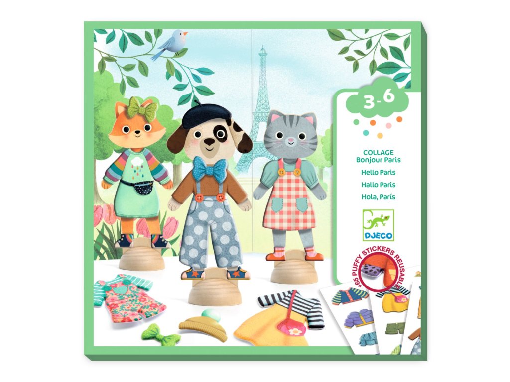 Ahoj Paríž: Obliekanie 3 postavičiek odnímateľnými samolepkami (koláž)