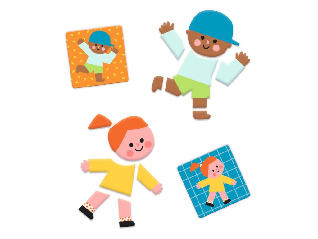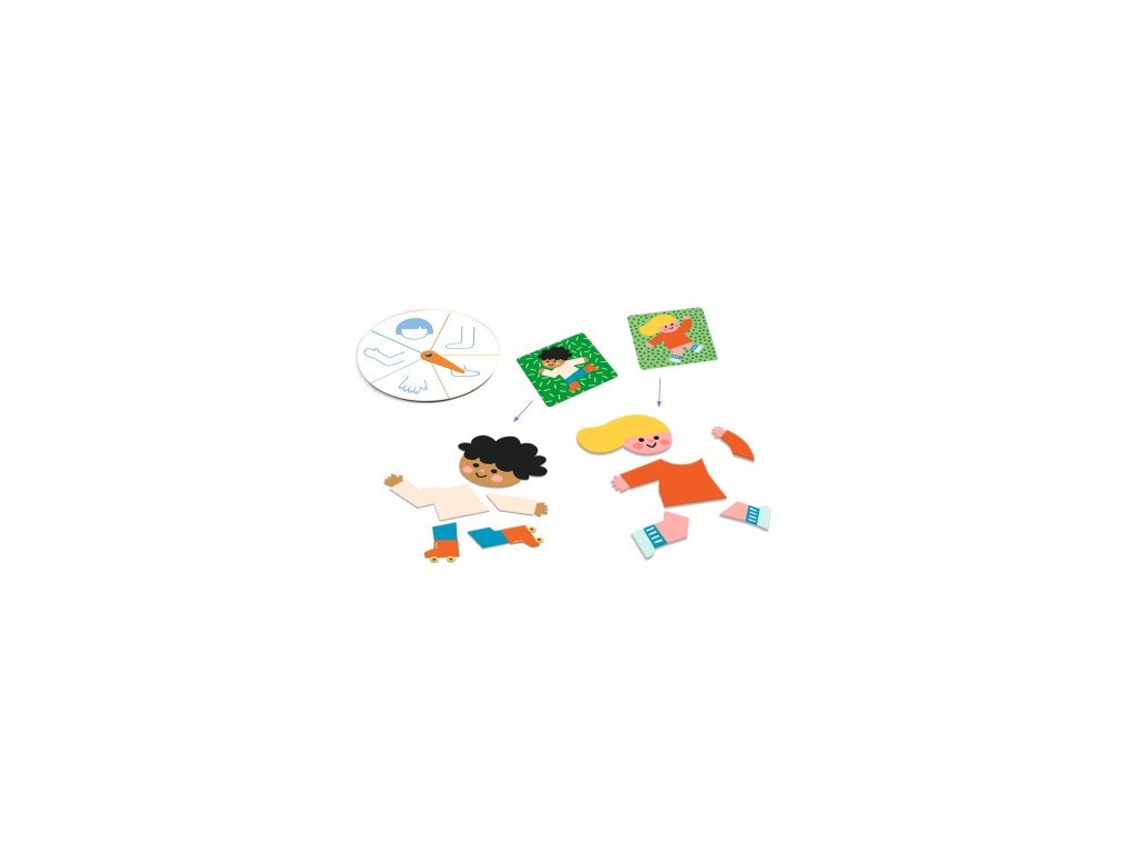 Malí hráči dokážu okamžite identifikovať každú časť vďaka ilustráciám pohybujúcich sa detí. Takto si ich môžu priradiť k vlastnému telu, čo uľahčuje učenie sa slovnej zásoby. - Vyrobené z papiera a kartónu s ekologickým certifikátom FSC®.