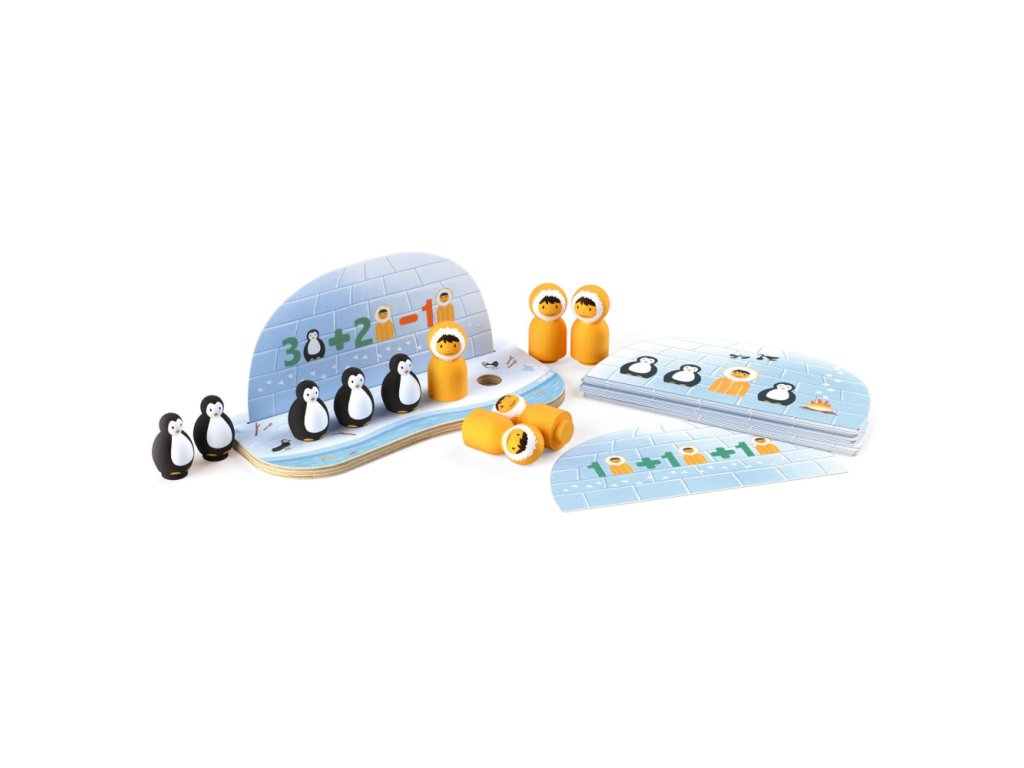 Názorné sčítanie a odčítanie od 1 do 5 s figúrkami tučniakov a eskimákov. Zadania sú na 20 siluetových kartách tvaru iglu. Dieťa vsadí kartu do základne a pred iglu postaví daný počet figúrok. Karty sú autokorekčné - správne riešenie je na rubovej strane.