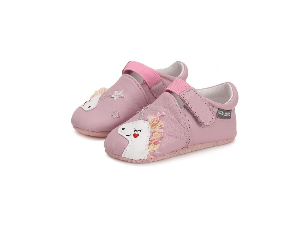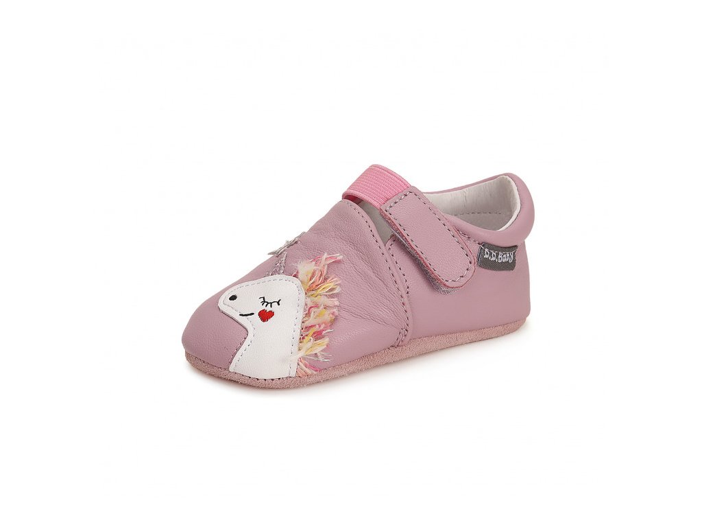 Celokožené našuchovacie capačky od výrobcu D.D.Step, ktoré sú vhodné už na prvé kroky. Podošva je tenká, je veľmi pružná a kožená. Je z brúsenej kože ružovej farby. V jej strede sa nachádza ružový gumený nápis D.D.Step, ktorý pôsobí protišmykovo.