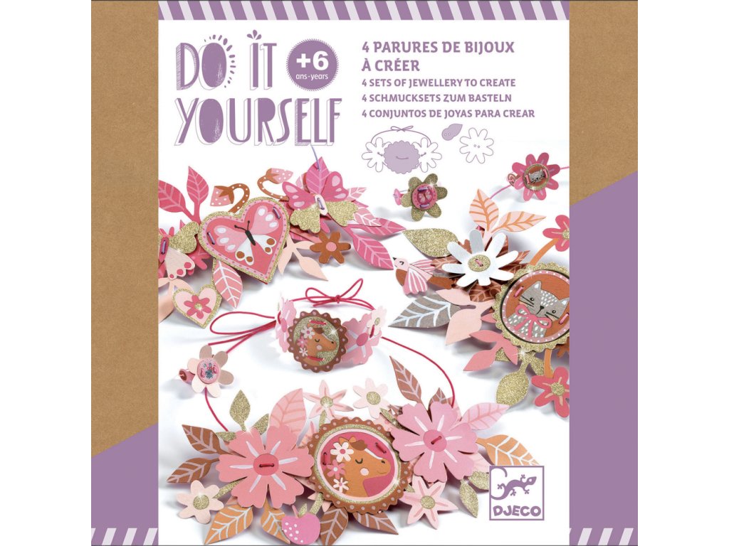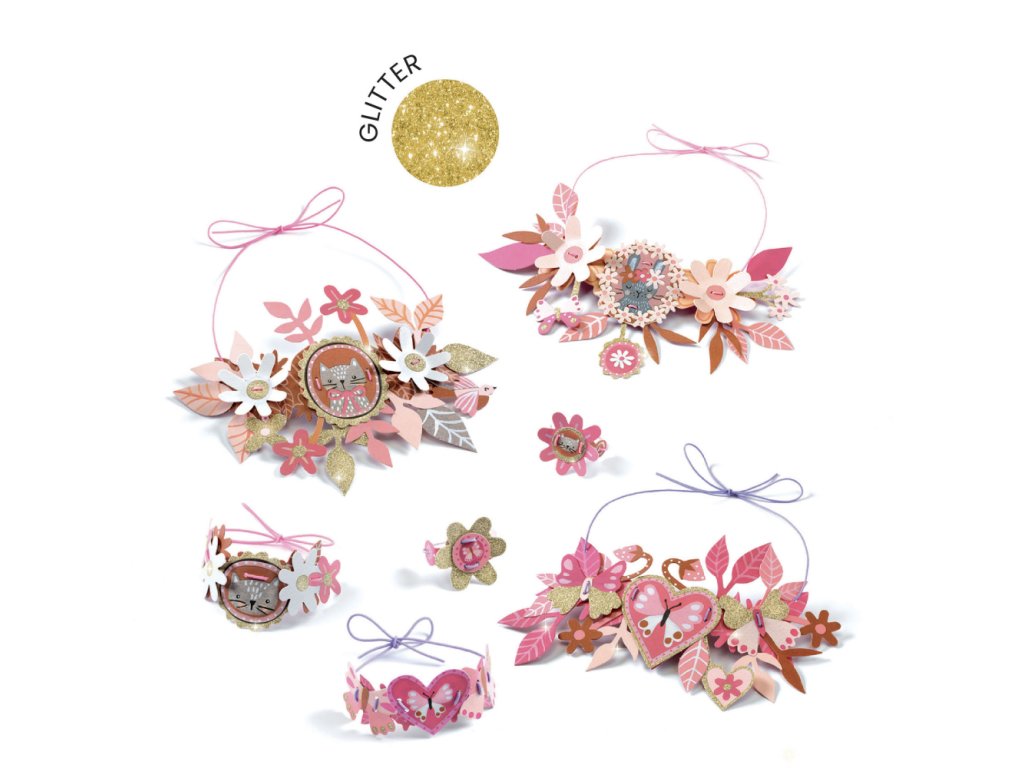 Kreatívna DIY sada na zhotovenie 4 setov papierovej bižutérie. Set pozostáva z náhrdelníka, náramku a prsteňa. Vytvoríš ich navliekaním papierových prvkov, kvetov a elegantných medailónov s portrétnymi ilustráciami zvieratiek, na elastické šnúrky. Pestré farby dopĺňajú zlaté trblietky. Pre jednoduchšie navliekanie sú papierové prvky na potrebných miestach predierované a správnu postupnosť pomôže udržať číslovanie na ich rubovej strane. Sada obsahuje dostatok materiálu na spoločné tvorenie v priateľskom kruhu.