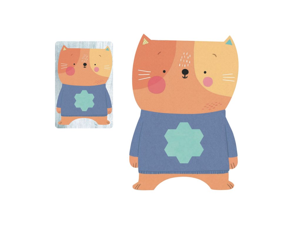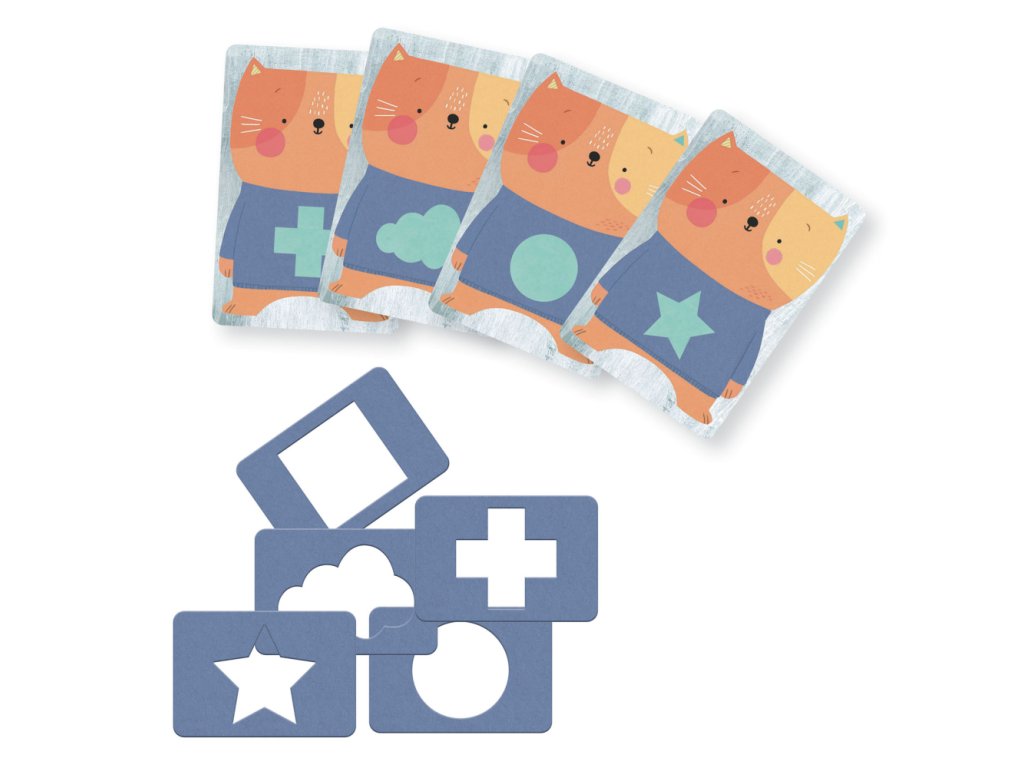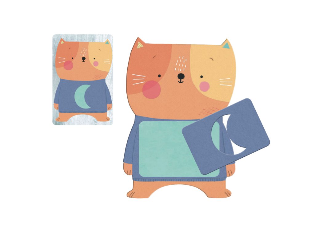 Podľa vzoru na tričku. Keď chceš získať kartu, prilož mačke na tričko správny vzor podľa zadania. Hra má dva varianty: „edukačný“ na určovanie farieb a „postrehový“ pre 2 hráčov.