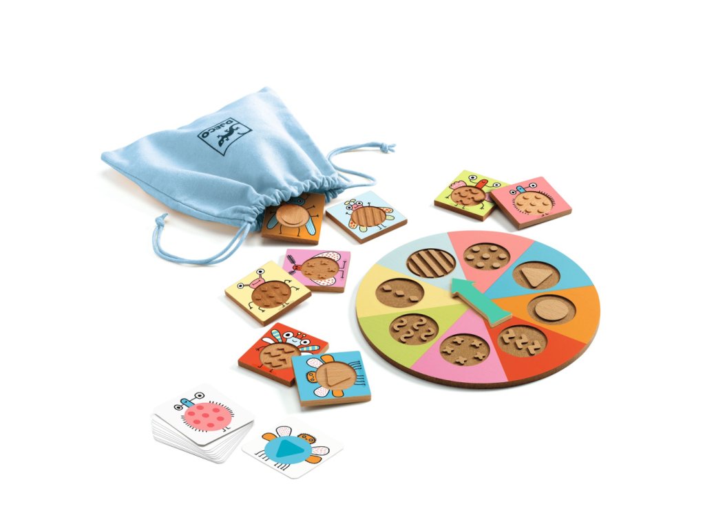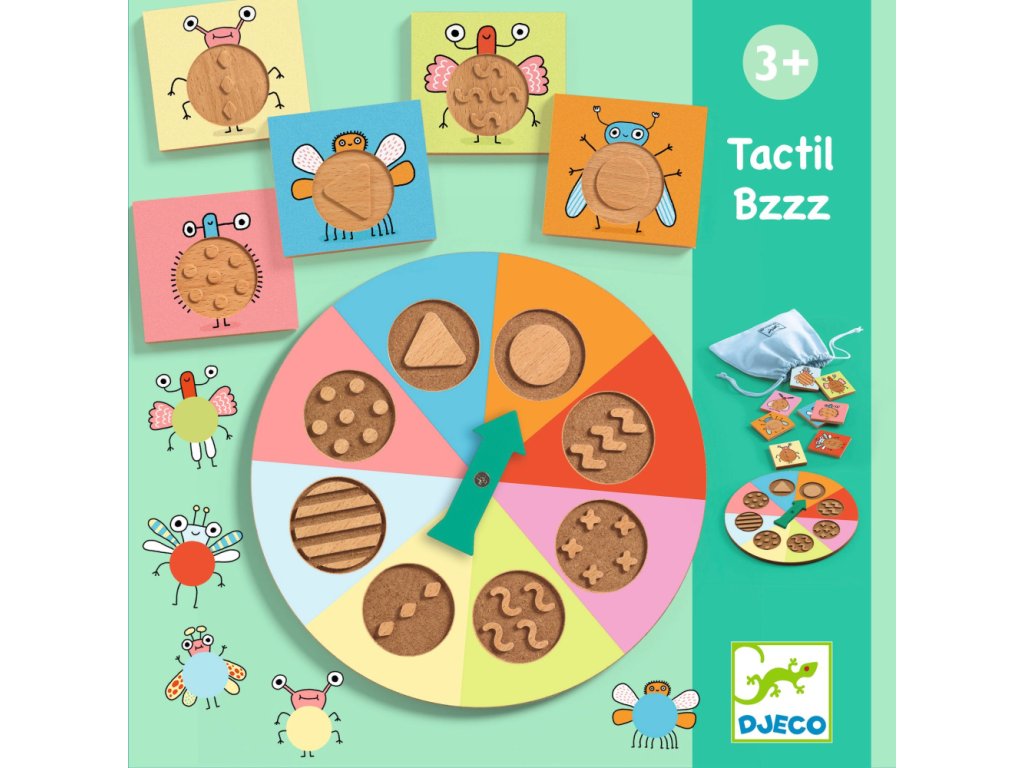 Hmatové loto s reliéfnymi drevenými doštičkami. Dieťa zatočí ruletkou a v látkovom vrecku skúsi nahmatať doštičku so vzorom, aký vytočilo ruletkou. Správne? Získa kartičku s rovnako vzorovaným hmyzom. Kto prvý získa 4 kartičky, je víťaz. Hra zábavným spôsobom rozvíja jemnú motoriku a hmat dieťaťa, ktoré sa naučí končekmi prstov rozoznať niekoľko grafických vzorov.