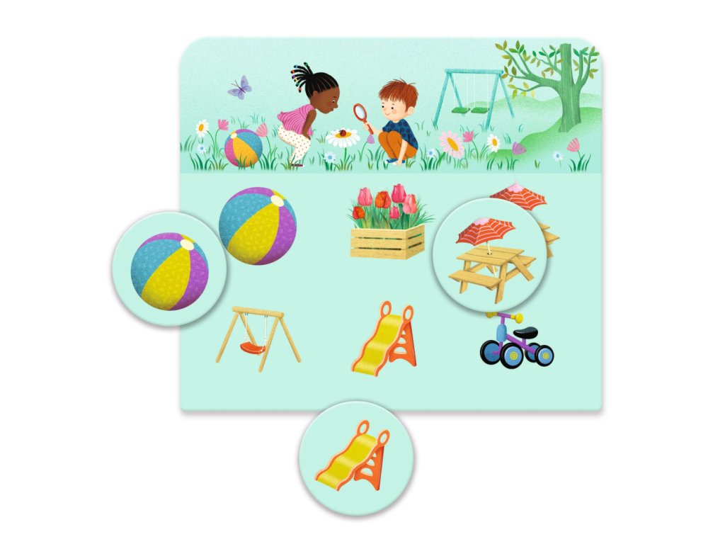 Hra umožňuje aj solitérny variant pre 1 hráča. Opisom obrázkov prispejete k aktívnemu rozvoju reči dieťaťa. Diely sú veľké a odolné - veríme, že z nich budete mať dlho radosť. Hra je balená v pekne ilustrovanej škatuli s praktickým povrázkom na nosenie. Vyrobené z lepenky a papiera s ekologickým certifikátom FSC®.