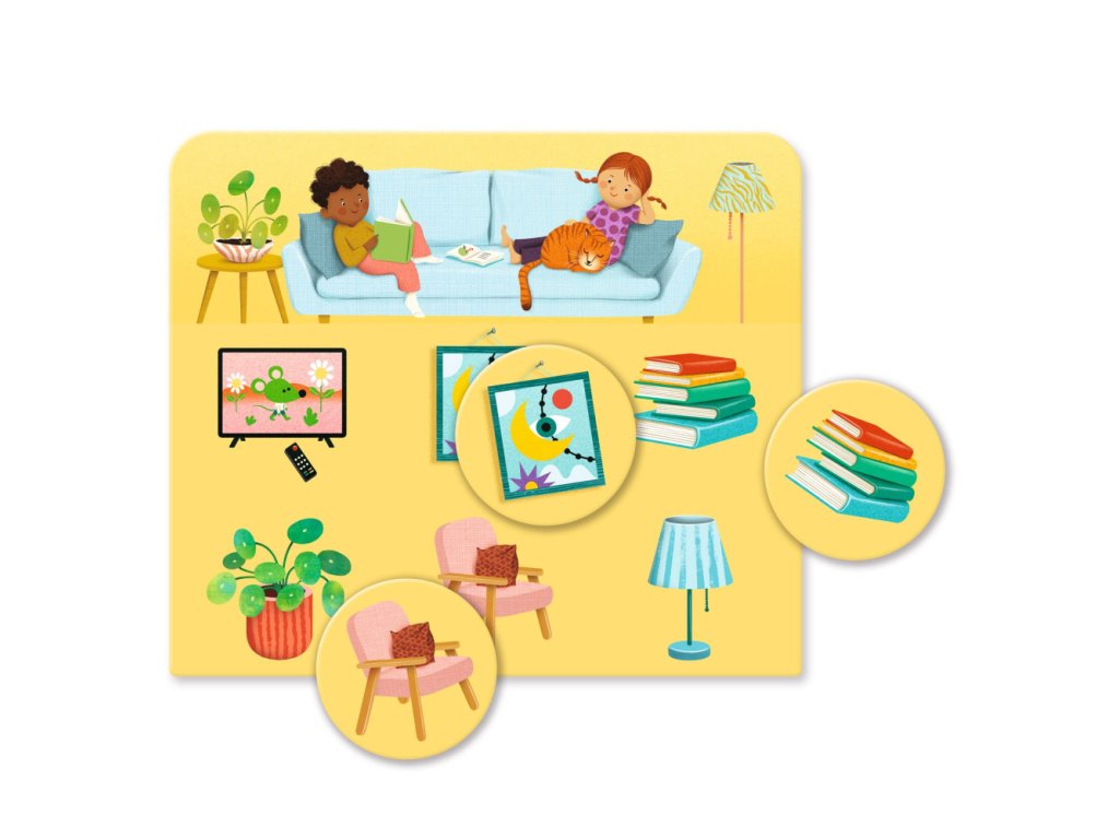 Obsahuje 5 herných dosiek s obrázkami vecí z izieb doma a okrúhle dieliky, na ktorých sú tieto veci zobrazené. Každý hráč si vyberie dosku, ktorá predstavuje určitú izbu. Otočí dielik ako pri pexese. Keď je na ňom vec, ktorá patrí do jeho izby, položí si ju na príslušný obrázok na doske. Ak nie, vráti ho - tu je šanca pre ostatných hráčov zapamätať si svoj dielik. Kto nájde prvý všetky svoje dieliky?