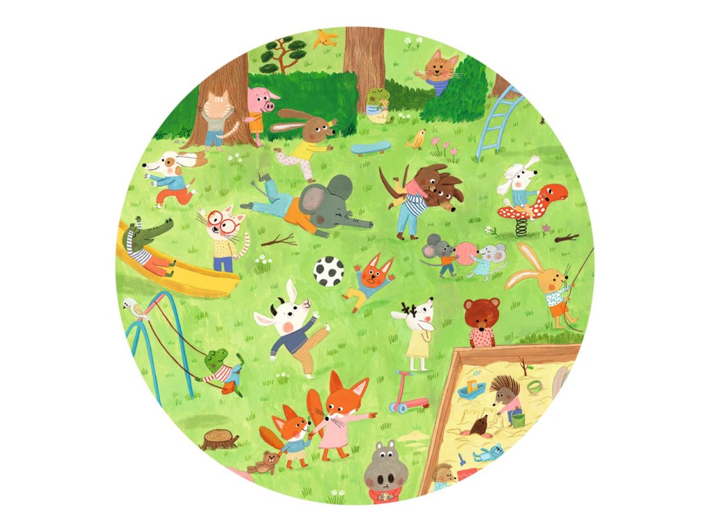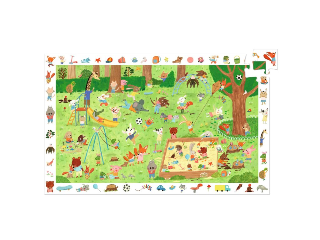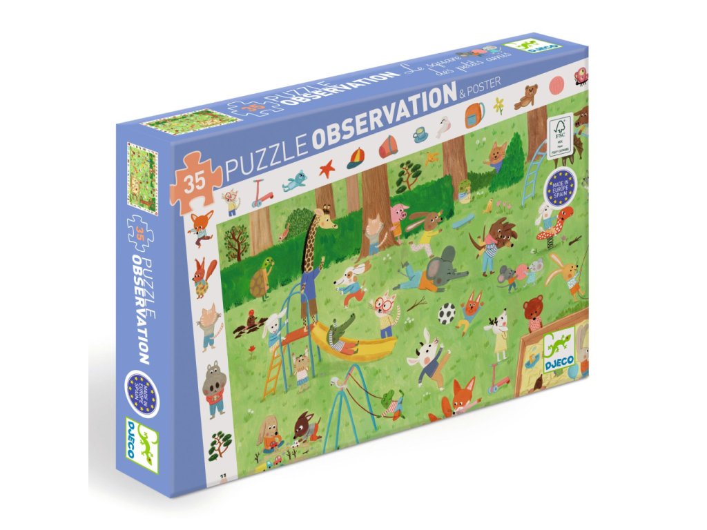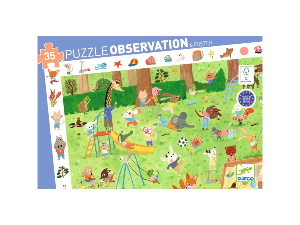 Objavovacie puzzle zobrazuje zvieratká hrajúce sa v parku. Puzzle je aj hľadacia hra. Dieťa hľadá na poskladanom puzzle detaily podľa obrázkov na okraji. Pribalený plagát rovnakých rozmerov ako puzzle poslúži ako predloha a podložka na skladanie. Diely sú hrubé a odolné, môžete skladať a skladať. Top kvalita! Vyrobené v Európe, Španielsku z lepenky a papiera s ekologickým certifikátom FSC®. Obsah: 35 dielikov, 1 plagát. Odporúčaný vek: 3+ rokov. Rozmery puzzle: 61 x 38 cm. Rozmery balenia: 34,2 x 23,5 x 4,6 cm.