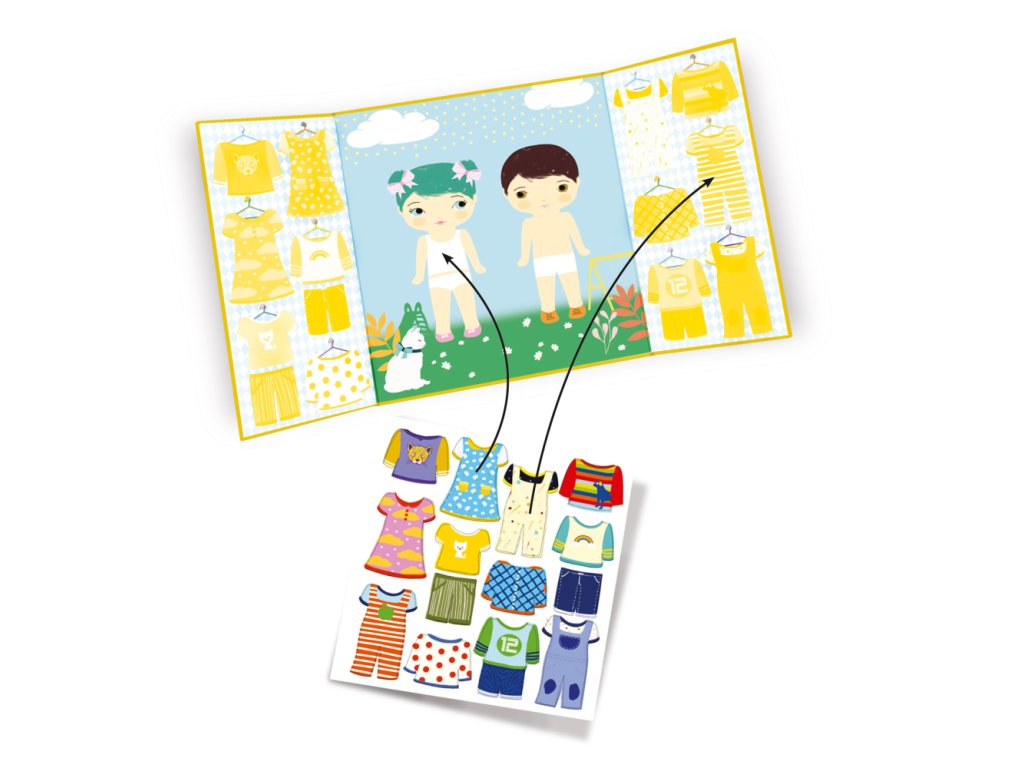 Na podložku- deti nalepuj oblečenie a obliekaj ich! Podložka má na bokoch zatvárateľné strany, kde je miesto na odloženie samolepiek. Samolepky sú znovuodlepiteľné a môžeš ich pohodlne prelepovať. Zatvárateľná podložka je veľmi praktický formát na hranie a zároveň uschovanie samolepiek. Malý kreatívny darček pre drobcov.