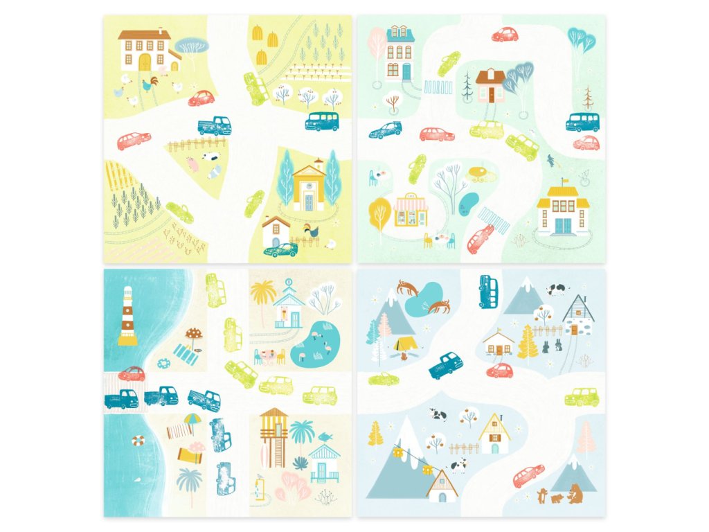 Dieťa doplní prázdne cesty na obrázkoch autíčkami. Cesty sú vsadené do prostredí vidiek, mestečko, pláž, hory. Obrázky sa dajú prepojiť a vznikne veľká sieť ciest s autami! Motívy na pečiatkach sú farebne odlíšené podľa farieb podušiek, aby sa pri namáčaní farby nemiešali.