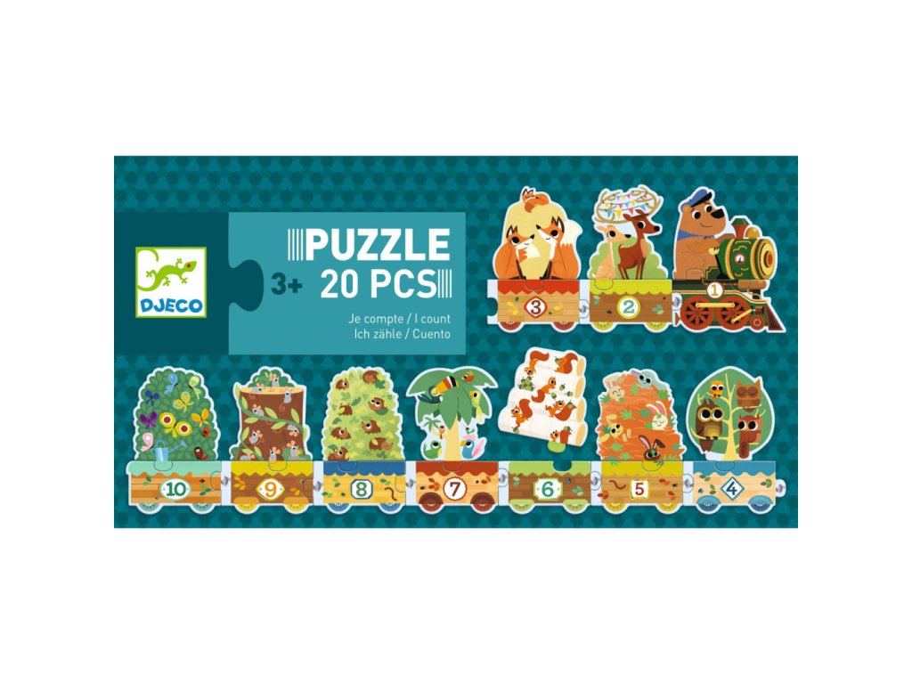 Dieťa spojí 10 dvojdielnych siluetových puzzle do 120 cm dlhého vláčika. Lokomotíva a vagóny sú očíslované od 1 do 10 a vozia daný počet zvieratiek. Vagóny musia byť zoradené v číselnom rade. Puzzle je autokorekčné (správne spojiť sa dajú len príslušné dvojice rovnakej farby) a dieťa môže skladať samostatne. Ilustrácie: David Partington. Puzzle podporuje rozvoj pozorovacích schopností a koncentráciu.