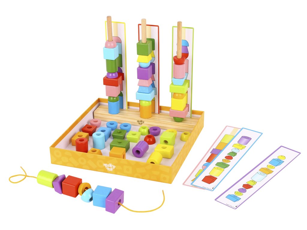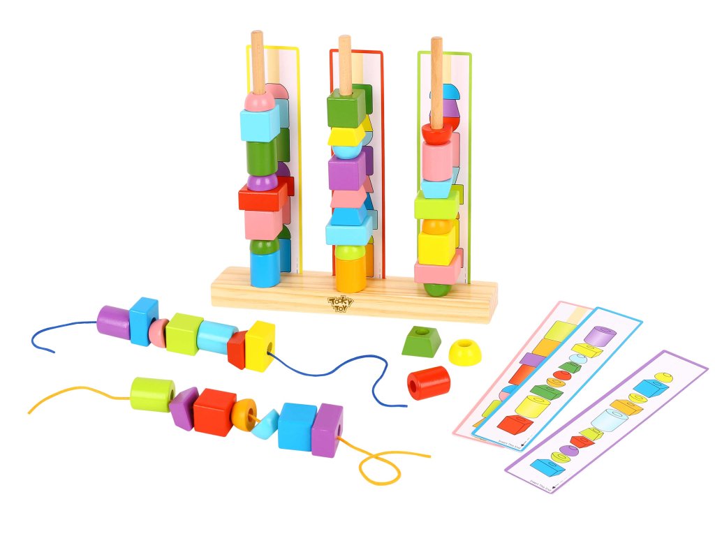 Kreatívna sada plná najrôznejších aktivít, s ktorou sa vaše deti nudiť rozhodne nebudú. Jednoduchá drevená hra potrápia nejednu hlavičku. Vďaka predlohám si deti vytvárajú najrôznejšie farebné veže podľa predlohy, ale tiež podľa vlastnej fantázie. Navliekať je ale môžu tiež na priložený povrázok.