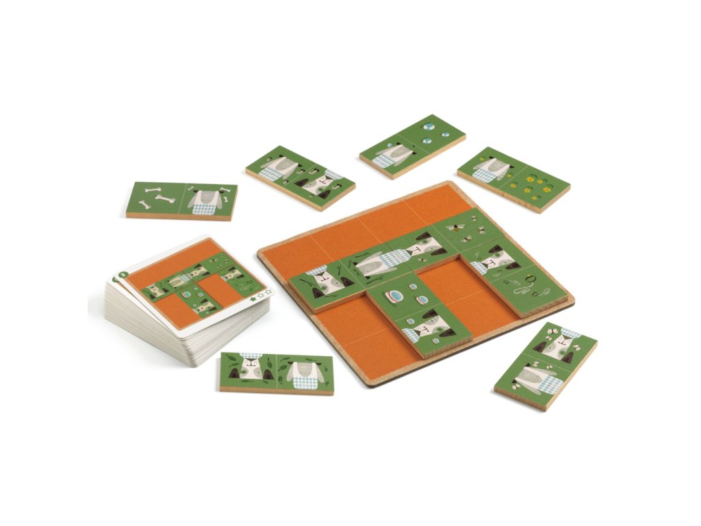 Hráč uloží dané domino diely na hernú dosku a ďalšie diely (spolu 8 ks) doplní do štvorca tak, aby boli ilustrácie psov celé. Pozor: dielov je 10, ale hráč použije iba 8 z nich. Ktoré 2 diely nepoužije? Každé zadanie má len 1 riešenie. Zadania sú 3 stupňov náročnosti. Riešenia sú na konci návodu na hru. Hra precvičuje logické myslenie a vytrvalosť. Autor: Alain Brobecker. Dizajn: Tom Frost.