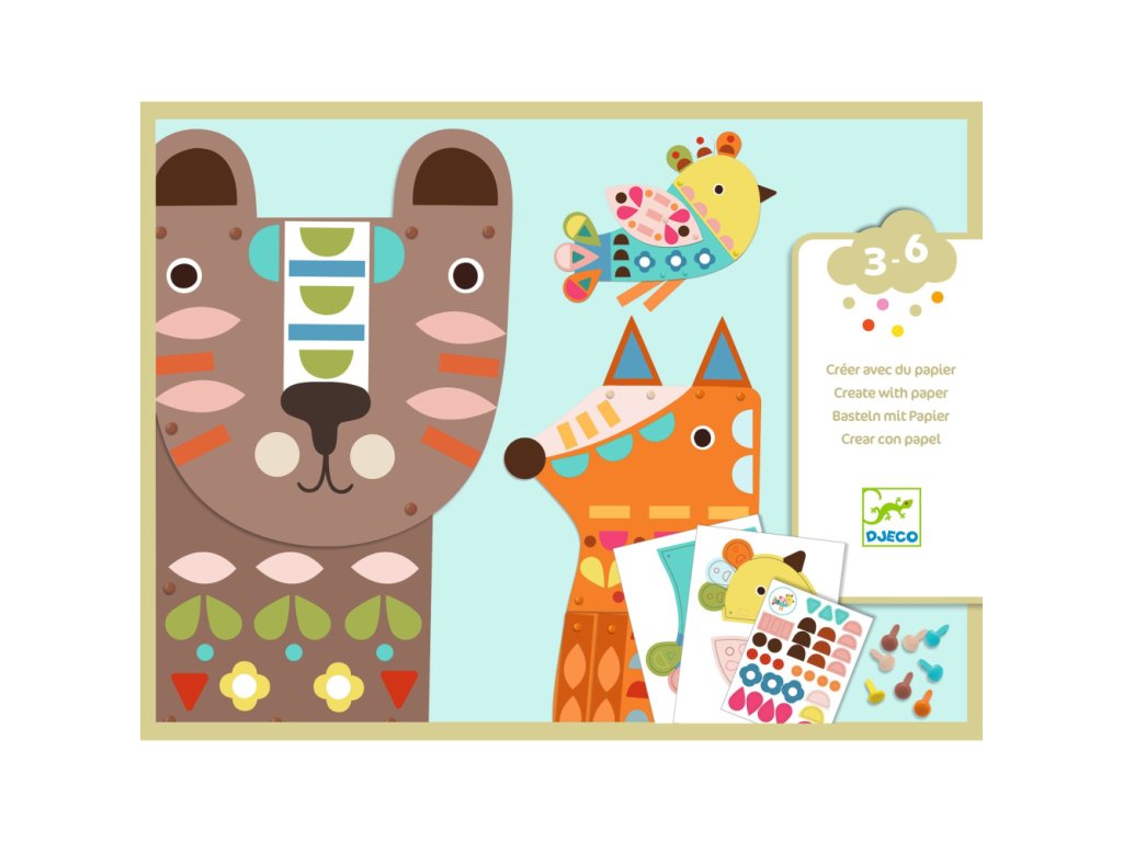 Dieťa ozdobí samolepkami jednotlivé diely zvieratiek a následne ich spojí roztváracími cvočkami. Výsledkom budú 3 obrovské farebne vzorované zvieratká: medveď, líška a vtáčik.