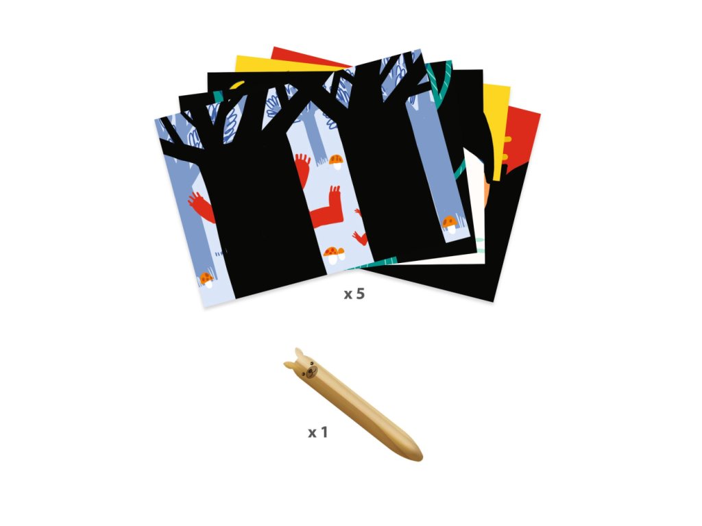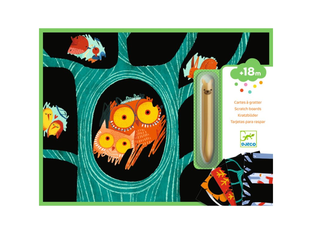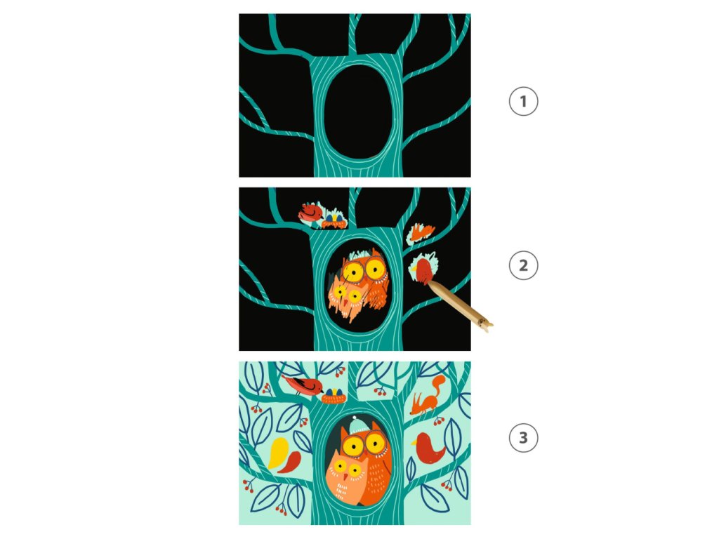 Pod čiernou vrstvou sa ukrývajú pestré a veselé ilustrácie zvieratiek: zvieratká v zime, tancujúce medvede v lese, prekvapené sovy a mláďatá liahnuce sa z vajíčok. Dieťa odkryje časti obrázka vyškrabovaním veľkou drevenou škrabkou s oblým hrotom. Na veľkých obrázkoch je dosť miesta na vyškrabovanie. Vyškrabovanie podporuje predstavivosť a jemnú motoriku. Zvedavé dieťa môže zoškrabať aj celú vrstvu a uvidí celý obrázok.