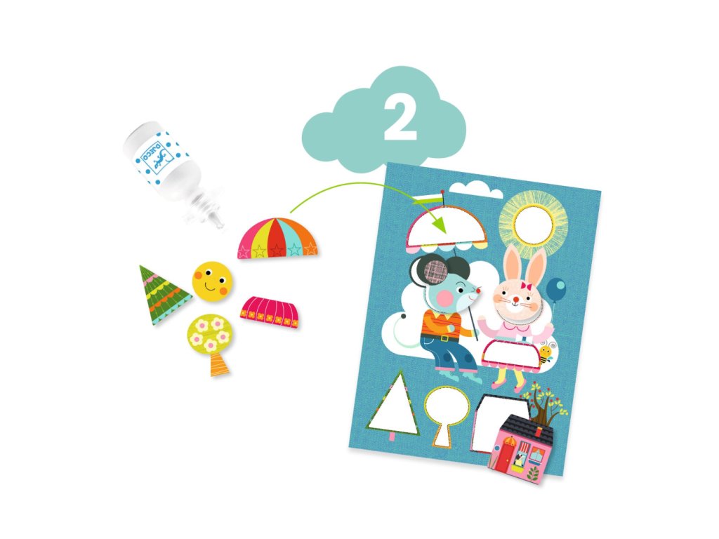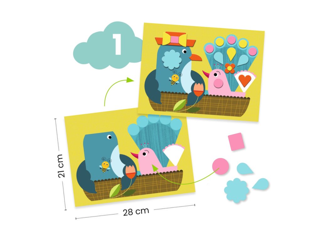 Výhody: - Kreatívna sada pre začiatočníkov. - 6 aktivít na objavovanie: klasická koláž, koláž z plsti, magické vyfarbovanie vodou a farbičkami, vyškrabovacie obrázky a kreslenie/vyfarbovanie pomocou šabóny. - Všetko potrebné je súčasťou balenia, prispôsobené veku detí a vo vysokej kvalite materiálov. - Rozvíja zručnosť, manipuláciu, presnosť a kreativitu. - Získanie informácií o farbách, tvaroch, veľkostiach a objeme. - Farebná inštruktážna brožúra obsahujúca iba obrázky. - Viaceré deti môžu tvoriť spolu - ideálne pre narodeninové oslavy alebo tvorivé dielne.