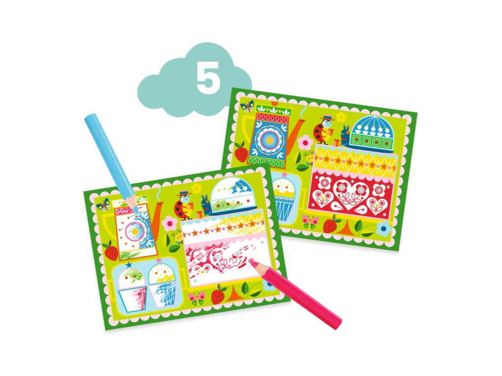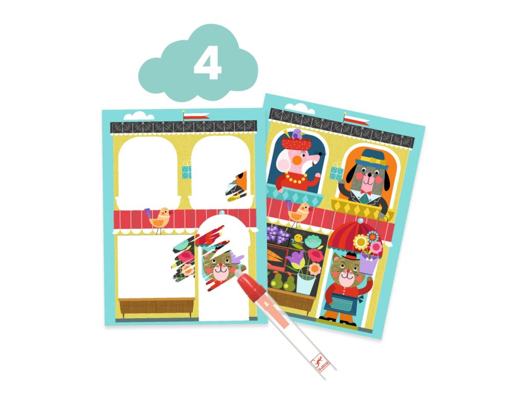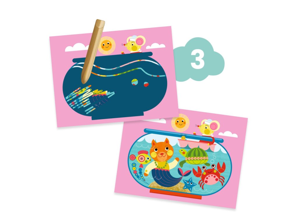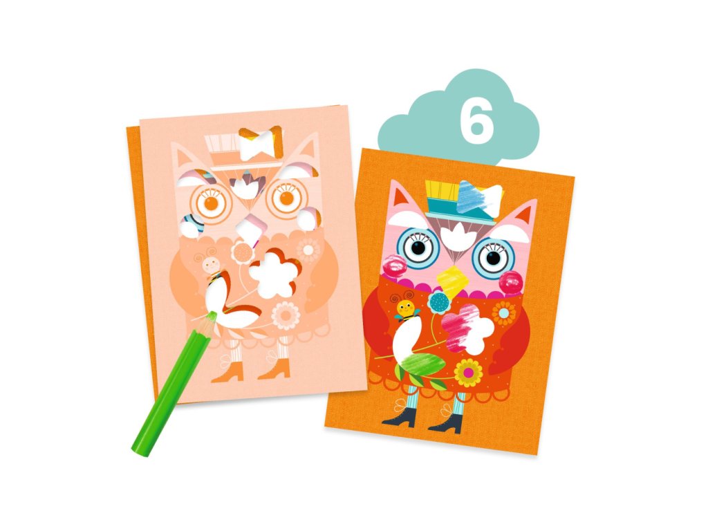 Obsah: - Klasická koláž: 1 ilustrovaná karta, 1 vopred narezaná doska z hrubej lepenky a 1 tuba lepidla. - Plstená koláž: 12 dosiek na dekoráciu a 4 hárky samolepiacich plstených dielikov. - Vyfarbovanie so šablónou: 4 ilustrované listy, 1 šablóna a 4 farebné ceruzky. - Magické vyfarbovanie vodou: 1 kartička s bielou vrstvou na opakované vyfarbenie a 1 štetec s filcovým hrotom a nádržkou na vodu. - Magické vyfarbovanie farbičkami: 3 karty na vyfarbenie s magickým povlakom. - Vyškrabovacie obrázky: 3 karty a 1 drevená škrabka na vyškrabovanie. - 1 obrázkový návod krok za krokom.